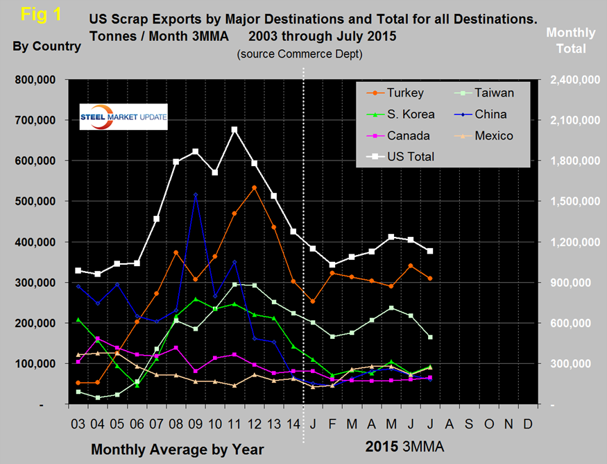 In the first seven months of this year bulk scrap exports were 7,809,000 tonnes for an annual rate of 13,387,000 tonnes, down by 11.6 percent from the first seven months of last year. The tonnages shown in Figure 1 are based on three month moving averages for 2015 and on the twelve month monthly average for previous years.