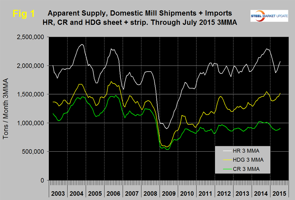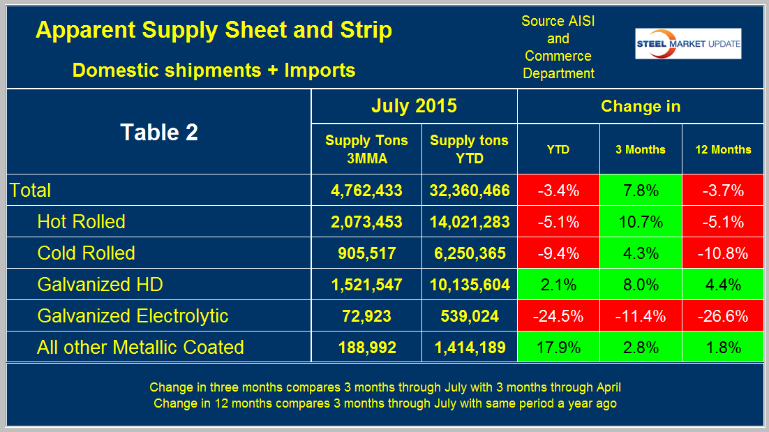 Apparent Supply is a proxy for market demand and is defined as domestic mill shipments to domestic locations plus imports. In the three months through July 2015 average monthly supply of sheet and strip was 4,762,433 tons, up by 7.8 percent from the previous three month period, February through April (3M/3M), down by 3.7 percent from the same period last year and down by 3.4 percent YTD compared to the first seven months of 2014. Table 2 shows the change in supply by product on the same basis through July.