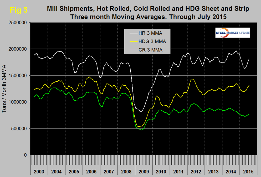 Hot rolled declined every month November through April then picked up in May, June and July. Cold rolled also declined in November through April and picked up slightly in May, June and July. Hot dipped galvanized declined in the period November through February and has picked back up in each of the last five months. In Q4 2014 all three were in higher demand than at any time since the recession that is no longer the case for hot and cold rolled but HDG is almost back to that situation.