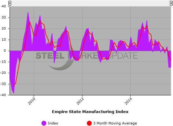 Below is a graph showing the history of the Empire State Manufacturing Index. You will need to view the graph on our website to use it’s interactive features, you can do so by clicking here. If you need assistance with either logging in or navigating the website, please contact our office at 800-432-3475 or info@SteelMarketUpdate.com.