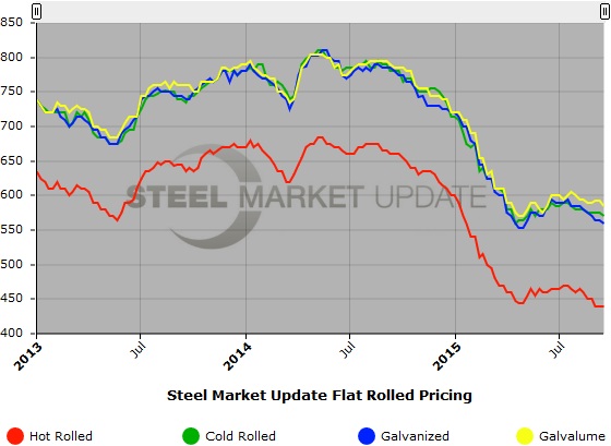 SMU Note: Below is a graphic showing our hot rolled, cold rolled, galvanized, and Galvalume price history. To use the graphs interactive capabilities, you must view it on our website here. If you need help navigating the website or need to know your login information, contact us at info@SteelMarketUpdate.com or by calling 800-432-3475.