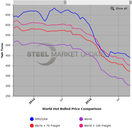 The latest Steel Market Update hot rolled price average is $440 per ton for domestic steel, down $10 per ton compared to the last time we did an update on world prices and down $20 per ton over mid-August. The theoretical spread between the world HR export price and the SMU HR price is $38 to $68 per ton ($138 prior to import costs), down $4 from our previous analysis and down $3 from mid-August.