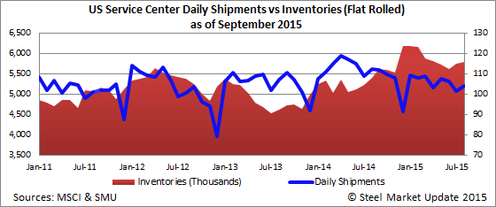 The Metal Service Center Institute (MSCI) released August distributor shipment and inventory data on Wednesday of this week. Total steel inventories remained essentially unchanged in August compared to July as the daily shipping rate declined by 3.8 percent. The biggest declines in shipments were attributed to carbon plate (-14.8 percent), structurals (-3.9 percent) and carbon shapes (-3.9 percent). Flat rolled products were actually down the least of all the steel products at -2.2 percent.