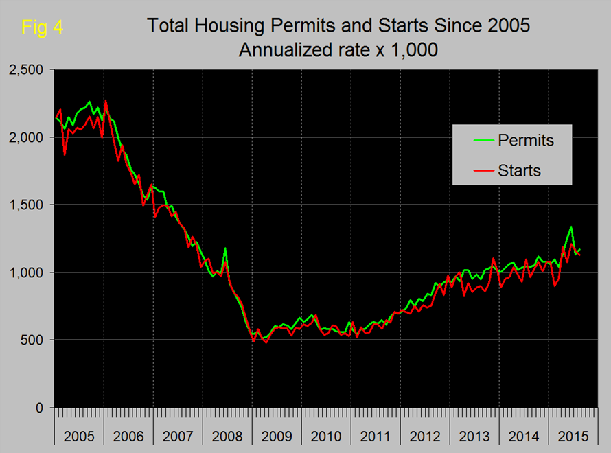 Multifamily (apartments/condominiums) starts in August were 387,000 with a 3MMA of 437. The 3MMA was driven strongly by a freak result in June of 524,000 and will most likely drop significantly in September. The Census Department results are seasonally adjusted and the monthly numbers are annualized. Multifamily starts had lack-luster growth for seven months prior to June but the last three months have returned to the level not seen since October last year, driven strongly by apartment construction in New York (Figure 2).