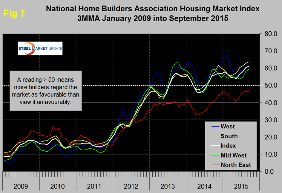 The National Association of Home Builders (NAHB) confidence report was released on Wednesday. Any value above 50 indicates an overall positive business confidence. The national average gained one point to 62 with a 3MMA of 61 which is the highest value since our data stream began in January 2009. All regions enjoyed an increase in confidence on a three month moving average basis except the NE which declined slightly in September (Figure 7). The South and west continue to be the strongest regions.