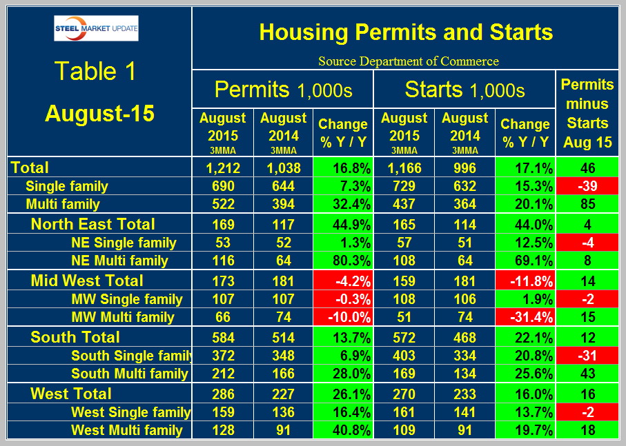 On a 3MMA basis total permits were up by 16.8 percent y/y. Single family were up by 7.3 percent and multifamily by 32.4 percent. Multifamily continued to be strongly influenced by activity in New York. Most economists have been expecting a decline in building permits driven by the end of a tax subsidy in New York State and this can be seen in the data, where permits in the North East fell from 234,000 in June to 53,000 in August.