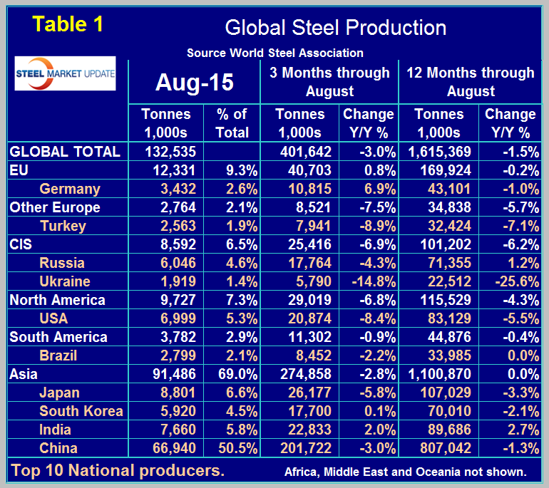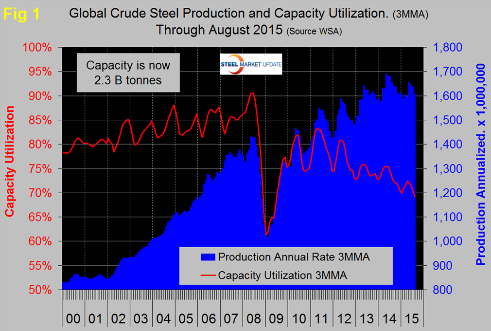 Global steel production in 12 months through August totaled 1.615 billion tonnes with a capacity of 2.3 billion tonnes. Capacity utilization in August was 68.4 percent with a three month moving average (3MMA) of 69.1 percent, down from 71.6 percent in three months through June. China accounted for 50.5 percent of global production in August. Asia as a whole, including India, accounted for 69.0 percent. Production in August on a tons per day basis was 4.275 million tonnes, down from 4.539 in June which was the highest month of the year.