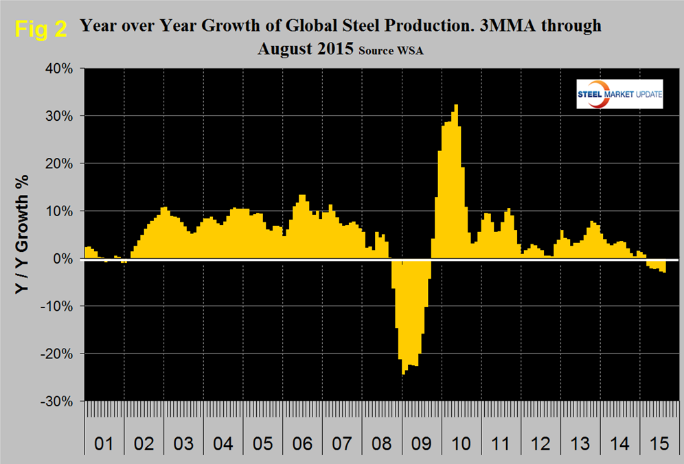 Figure 2 shows the 3MMA of the monthly year over year growth of global steel production which was negative in January for the first time since September 2009. Negative year over year growth has steadily increased from 0.2 percent in January to 3.0 percent in August.