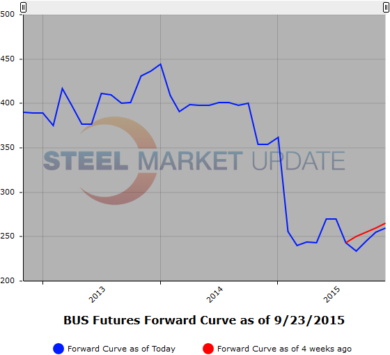 Well, spot Iron Ore has held up. We are last $56/MT approximately on the index and the forwards remain fairly well backwardated. Drivers still seems to be lean inventories at port and mill locations, despite rises off the lows, and lower shipments of Ore from the likes of Australia and Brazil. Recent uptick in freight rates may suggest that that trend may change, we’ll see. Let’s call Oct. either side of $54/MT, Nov. either side of $51.50/MT, Q4 either side of $51.65/MT, Q1 either side of $47.25/MT, Q2 either side of $44.55/MT and Cal ’16 either side of $44.35/MT.