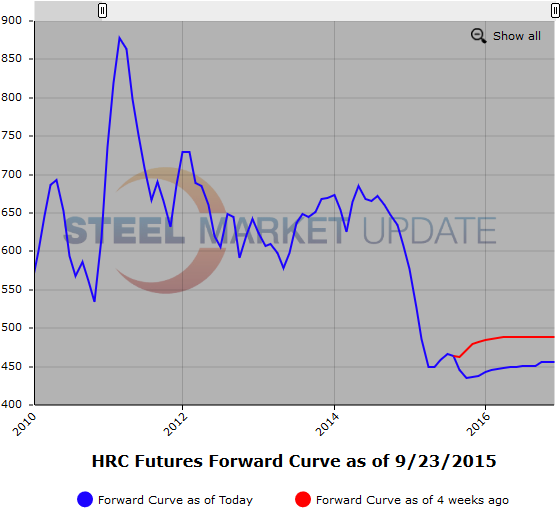 elow is a graphic of the HRC Futures Forward Curve. The interactive capabilities of the graph can only be used in Steel Market Update website here. If you have any issues logging in or navigating the website please contact us at info@steelmarketupdate.com or (800) 432 3475.