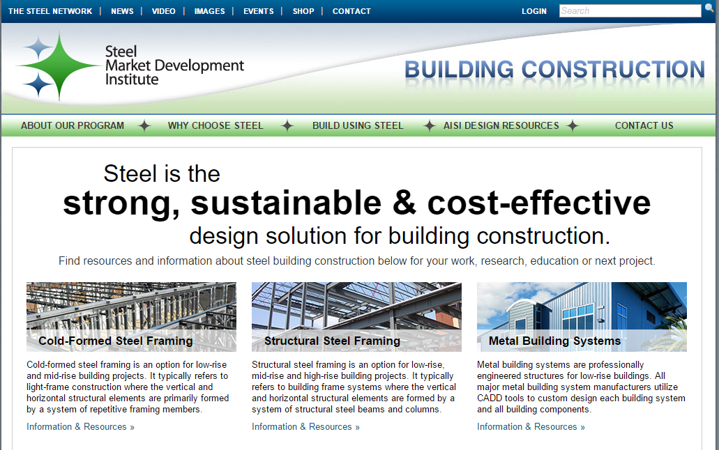 WASHINGTON, D.C., September 24, 2015 – The Steel Market Development Institute (SMDI), a business unit of the American Iron and Steel Institute (AISI), has launched a new website that focuses on using steel for building construction. The new site, located at www.buildusingsteel.org, provides information for engineers, architects, owners, building contractors, code officials and other construction professionals; allows easy access to design resources; directs users to additional steel construction associations with information on cold-formed steel framing, structural steel framing, steel deck, steel joists, metal building systems, and metal roof and wall systems; and provides a tool for users to contact cold-formed steel framing professionals with individual project questions.