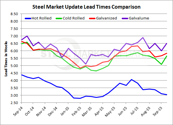 At first glance at last week’s result, what we found is hot rolled lead times continue to be short and are not making any headway. Cold rolled and galvanized lead times continue to be about one week shorter than what we saw one year ago. Galvalume is now being reported as being one half a week shorter than this time last year.