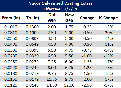 Nucor, recognizing the changes in the value of zinc (and thus their reduced costs to coat galvanized steel), sent out a letter to their customers on Monday advising that they were adjusting their coating extras effective with orders acknowledged to ship the week ending November 7, 2015 (the first week of November).