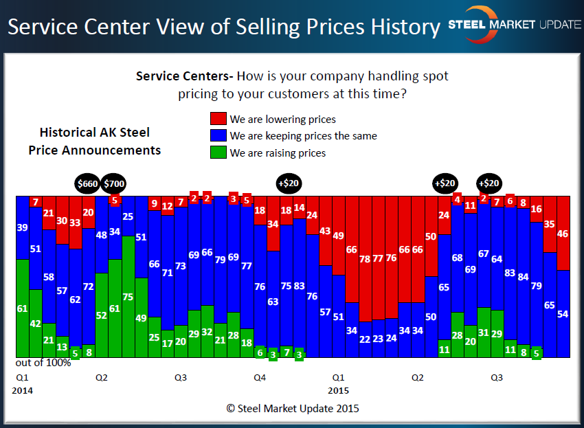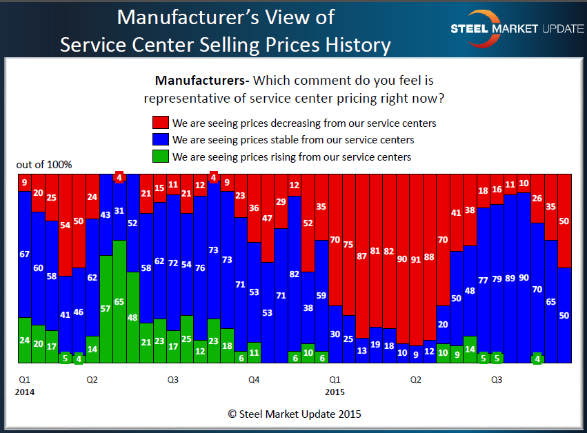 As you can see by the graphic below, we saw the highest percentage of manufacturing companies ever reporting service centers as dropping prices back in 1st Quarter 2015 and into early 2nd Quarter. The domestic mills were able to briefly raise prices at that point, stabilizing the markets for a couple of months.