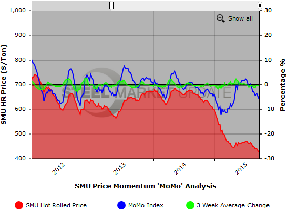 The graph below demonstrates the relationship between the SMU hot rolled coil price, the SMU Price MoMo Index, and the three week moving average change in the MoMo Index. Initially published in our Tuesday evening issue, the SMU HRC price range for this week is $410-$450 per ton with an average price of $430, unchanged from last week.