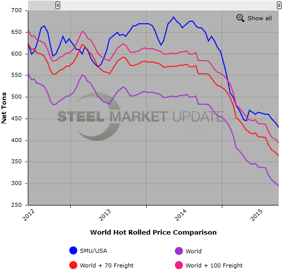 Below is a graph comparing world HR export prices against the SMU domestic HR average price. We also have included a comparison with freight and traders’ costs added which gives you a better indication of the true price spread. You will need to view the graph on our website to use it’s interactive features, you can do so by clicking here. If you need assistance with either logging in or navigating the website, please contact us at 800-432-3475 or info@SteelMarketUpdate.com.