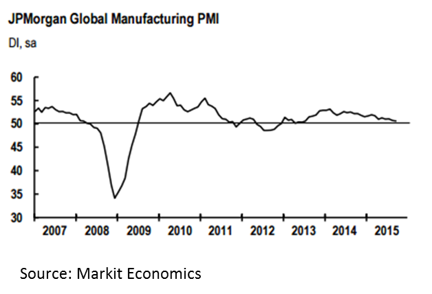 Global manufacturing has been trending flat to downward for most of 2015. The JP Morgan Global Manufacturing PMI continued that trend in September with a posting of 50.6 from 50.7 in August. The PMI was the lowest it has been since July and has averaged 50.8 for third quarter. Any reading over 50.0 is considered expansion.