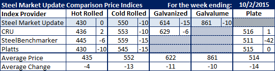 Cold rolled dropped the most with all four indexes moving lower by double digits. Platts and SteelBenchmarker were down $15 per ton with CRU and SMUdown $10.
