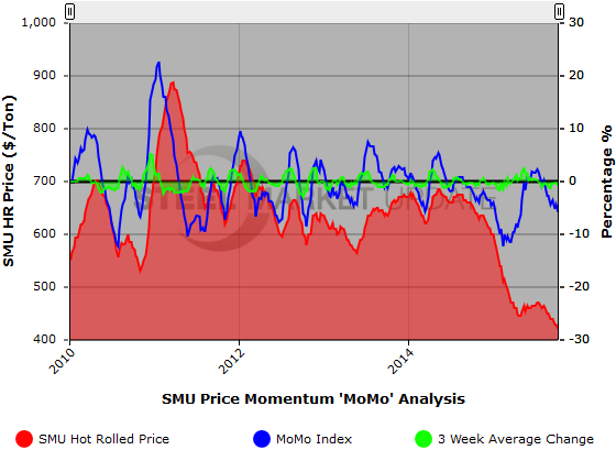 The graph below demonstrates the relationship between the SMU hot rolled coil price, the SMU Price MoMo Index, and the three week moving average change in the MoMo Index. Initially published in our Tuesday evening issue, the SMU HRC price range for this week is $400-$440 per ton with an average price of $420, down $10 per ton from last week.