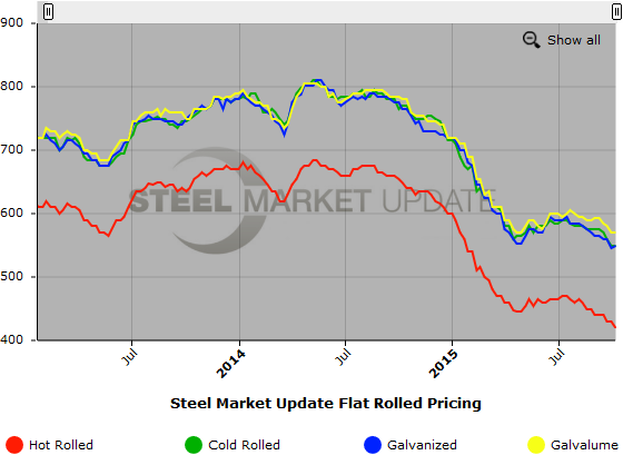 SMU Note: Below is a graphic showing our hot rolled, cold rolled, galvanized, and Galvalume price history. To use the graphs interactive capabilities, you must view it on our website here. If you need help navigating the website or need to know your login information, contact us at info@SteelMarketUpdate.com or by calling 800-432-3475.