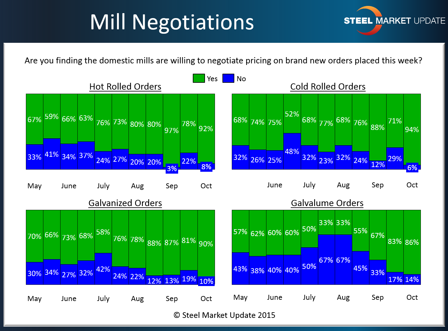 A side note: The data for both lead times and negotiations comes from only service center and manufacturer respondents. We do not include commentary from the steel mills, trading companies or toll processors in this particular group of questions.