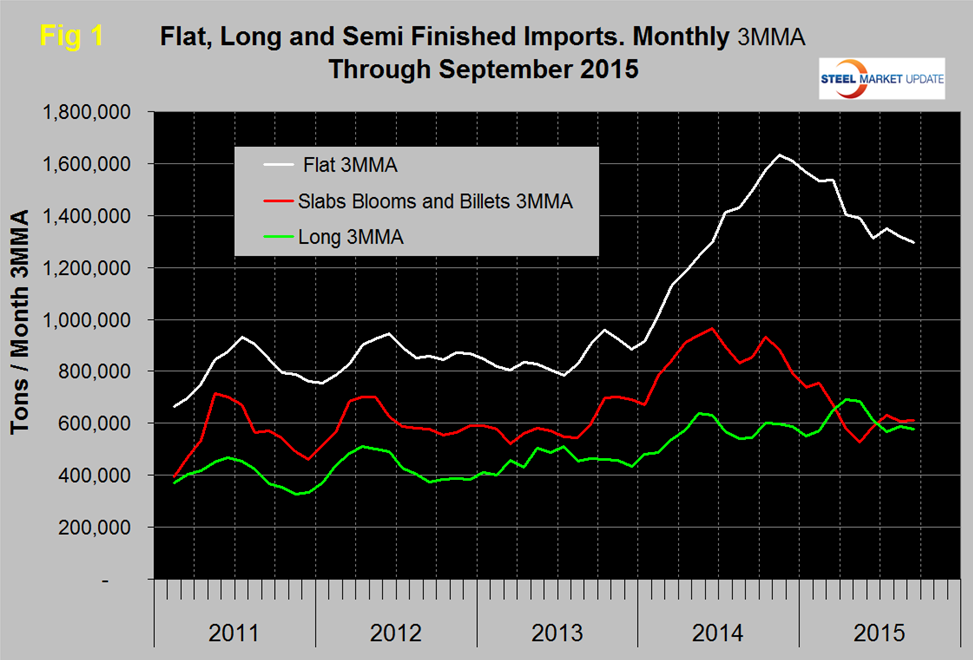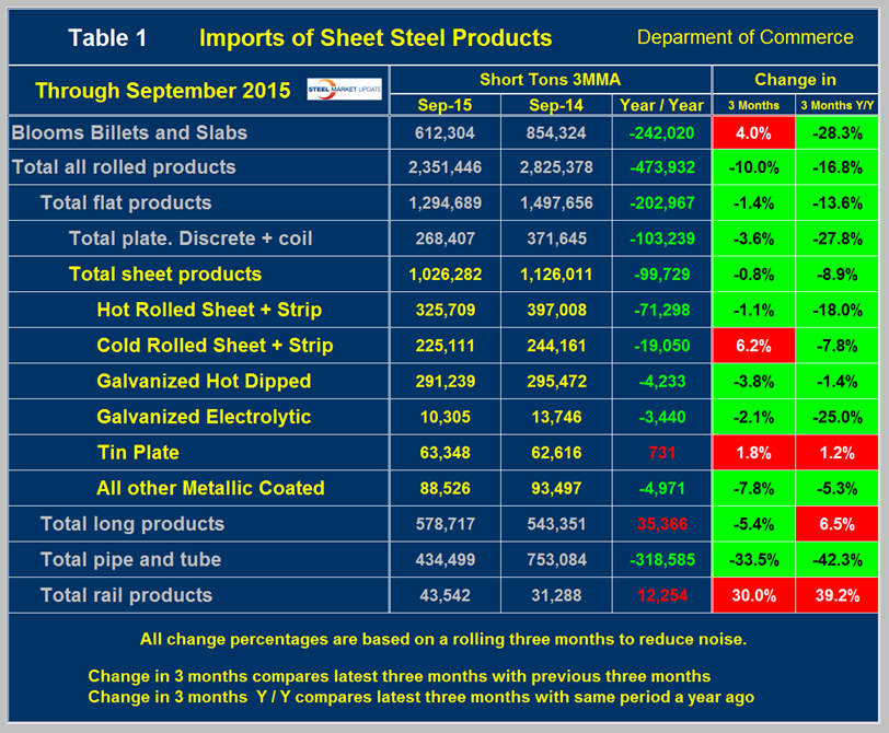 Table 1 provides an analysis of major product groups and of sheet products in detail. It compares the average monthly tonnage in the latest three months through September with both three months through June (3M/3M) and three months through September last year (Y/Y). Semi-finished slabs, blooms and billets were up by 4.0 percent 3M/3M but down by 28.3 percent Y/Y. The total tonnage of hot worked products was 2,351,446 tons in September on a 3MMA basis, down by 473,932 tons from September last year. The three moving average was down by 10.0 percent from the average of three months through June and down by 16.8 percent from a year ago. These trends indicate that in the big picture the peak of import volume has passed and this is generally true for all products though some more than others. The color codes in Table 1 for the three month and year over year change show which products are improving and which have still experienced import volume increases in these two time frames. It sometimes seems to us as we write these reports that we are contradicting ourselves but if readers use the tables for short term evaluation and the graphs for long term then our analysis should make sense.