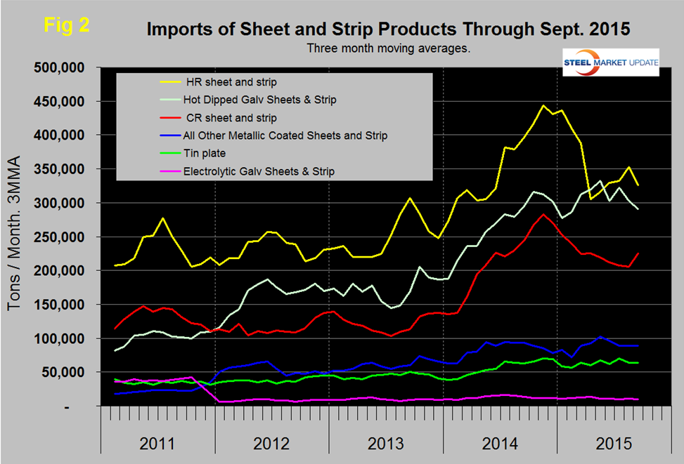 Figure 2 shows the trend of sheet and strip products since January 2011 as three month moving averages. Of the big three tonnage items, HR, CR and HDG, hot rolled which was down by 21.2 percent in April steadily increased in May through August and declined again in this latest data. Cold rolled peaked at 283,000 tons in November and decreased to 205,773 tons in August then increased again to 225,111 tons in September. Hot dipped galvanized imports increased in February through May and have been erratically decreasing since then. All other metallic coated (mainly Galvalume), peaked in May at 102,000 tons, decreased in June and July and since then have been flat. Tin plate had been trending up for all of 2014 but has been range bound this year. Electro-galvanized keeps on rolling along with little change in three years.