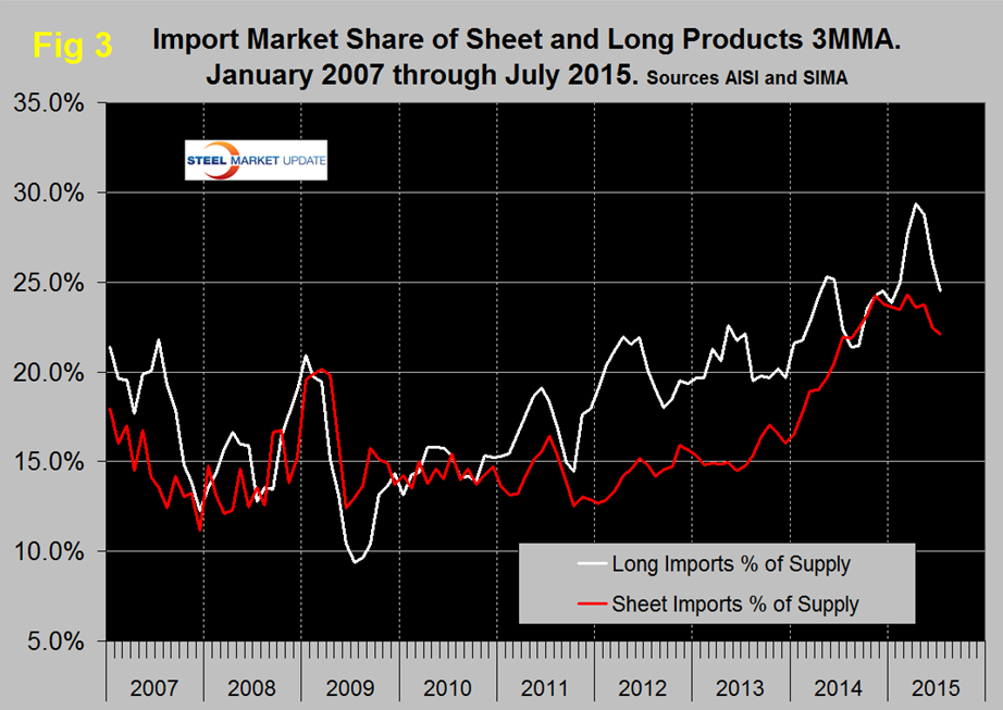 Figure 3 shows the import market share of long and flat products through July which is the latest data available for total steel supply. For long products the import share skyrocketed in January through April then declined sharply in May, June and July. The import market share for sheet products peaked at 24.3 percent in March and fell to 22.1 percent in July.