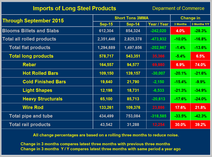 Table 2 shows the same analysis for long products. For total long products the tonnage was down by 5.4 percent 3M/3M but up by 6.5 percent Y/Y. In the 3M/3M comparison, rebar and wire rod both increased which they also did year over year. Having said that we need to break our rule and observe that in the single month of September rebar was down by 36 percent from August. Imports of pipe and tube declined by 33.5 percent 3M/3M and by 42.3 percent y/y. In the single month of September, rail products at 61,756 were the highest since April 2013 and the 3MMA was at the top end of the range that has existed since the recession.