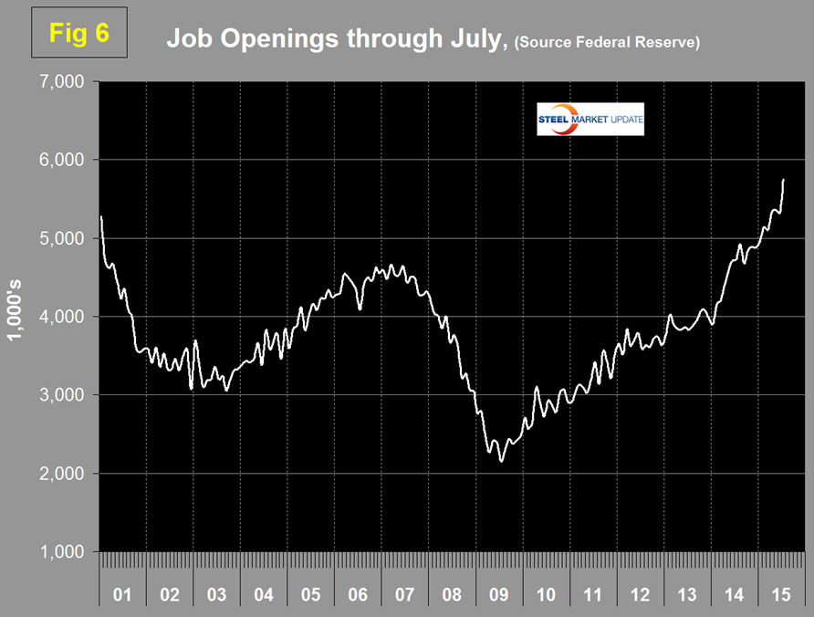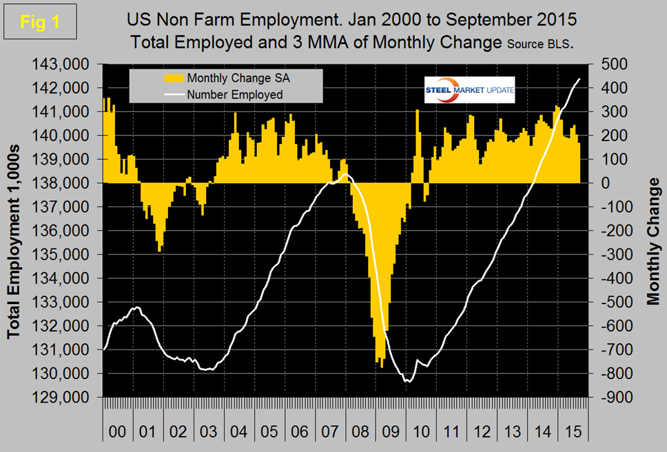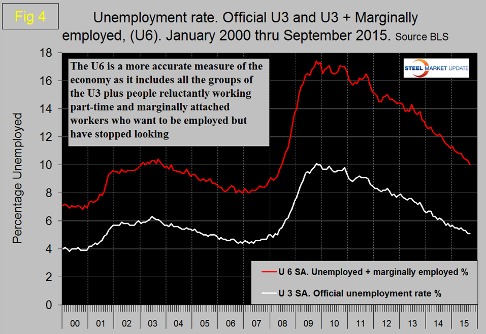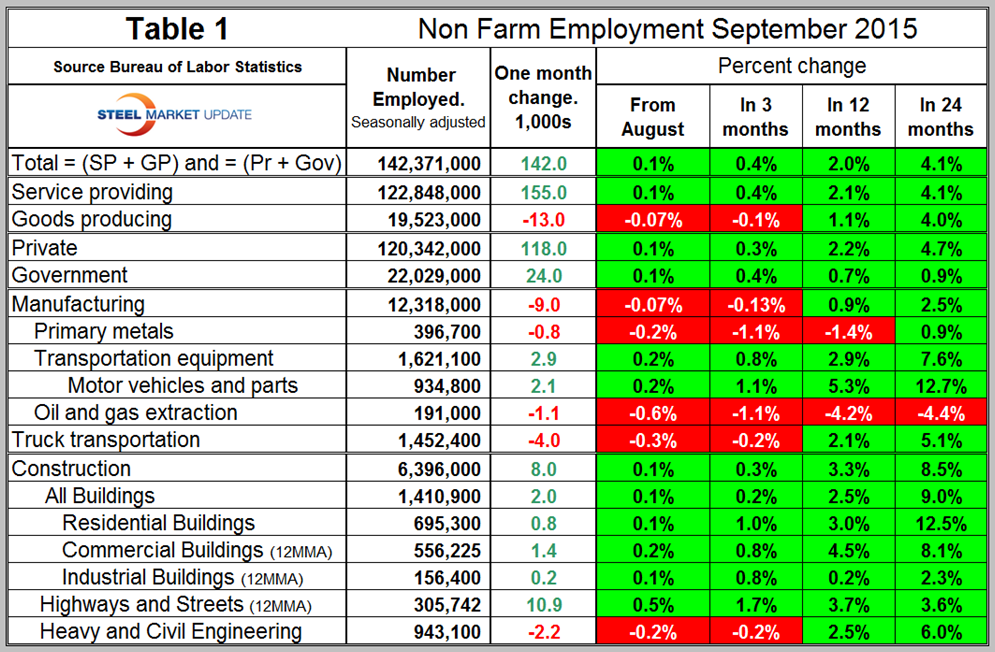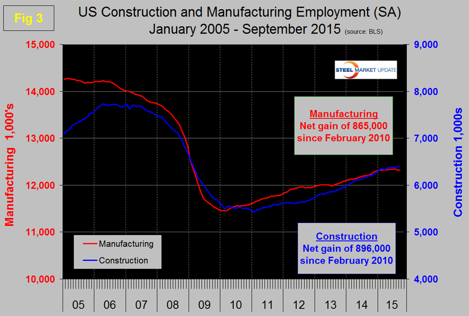 Returning to Table 1 we see that manufacturing lost 9,000 jobs in September. In all of 2015, manufacturing has gained only 17,000 jobs, another indication along with the ISM Manufacturing Index and the Federal Reserve Industrial Production Index that this sector is slowing. Note the subcomponents of both manufacturing and construction shown don’t add up to the total because we have only included those that have most relevance to the steel industry. Primary metals lost 800 jobs in September, is down by 1.4 percent in the last 12 months and has not had a single positive growth month in 2015. Motor vehicles and parts gained 2,100 jobs in September, oil and gas extraction has had negative job creation in all four time periods examined in Table 1. Truck transportation has deteriorated every month since May culminating in 4,000 jobs lost in September. Construction added 8,000 jobs in September which was the best result since May. Some of the major construction sub categories are routinely reported one month in arrears which distorts the data in Table 1. These include, industrial buildings, commercial buildings and highways and streets. The number of unemployed workers with construction experience dropped to the lowest total for August since 2001, as hiring slowed despite robust demand for construction, according to an analysis by the Associated General Contractors of America. On September 23rd the AGC reported on regional construction employment changes as follows; “seasonally adjusted construction employment rose in 36 states and the District of Columbia from August 2014 to August 2015, declined in 13 states and held steady in North Dakota, an AGC analysis of Bureau of Labor Statistics (BLS) data released today showed. The number of places with year-over-year gains was the smallest since April 2012. California again gained the most construction jobs (43,800 jobs, 6.5 percent), followed by Florida (25,700, 6.4 percent), North Carolina (13,200, 7.4 percent), Washington (12,800, 8.0 percent) and Texas (11,400, 1.7 percent). The highest percentage of new construction jobs were again added by Arkansas (14 percent, 6,200) and Idaho (10 percent, 3,600), followed by South Carolina (9.1 percent, 7,500) and Iowa (8.9 percent, 6,700). The steepest percentage losses again occurred in West Virginia (-15 percent, -5,100) and Rhode Island (-7.9 percent, -1,300), followed by Mississippi (-7.4 percent, -3,600), Ohio (-5.7 percent, -11,300) and New Mexico (-5.2 percent, -2,200). Ohio and West Virginia again had the largest losses, followed by Mississippi, Indiana (-3,600, -2.9 percent) and Louisiana (-3,500, -2.4 percent). For the month, there were gains in 25 states, losses in 24 and D.C., and no change in Louisiana.”