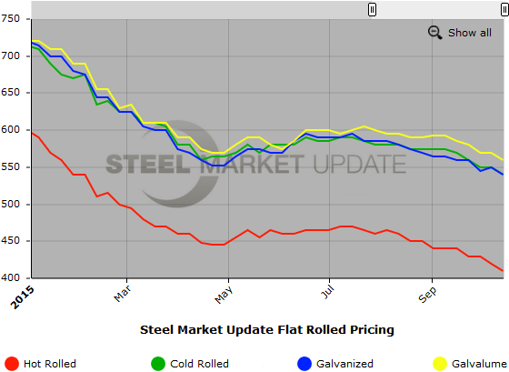 SMU Note: Below is a graphic showing our hot rolled, cold rolled, galvanized, and Galvalume price history. To use the graphs interactive capabilities, you must view it on our website here. If you need help navigating the website or need to know your login information, contact us at info@SteelMarketUpdate.com or by calling 800-432-3475.