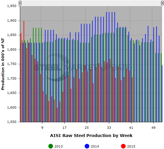 For the week ending October 10, 2015, the American Iron & Steel Institute (AISI) estimated the U.S. steel industry produced 1,705,000 net tons of raw steel, a 1.3 percent decrease over the previous week and a 7.3 percent decrease over the same week one year ago. The estimated capacity utilization rate is 71.3 percent, down from 72.2 percent last week and down from 76.5 percent this time last year.