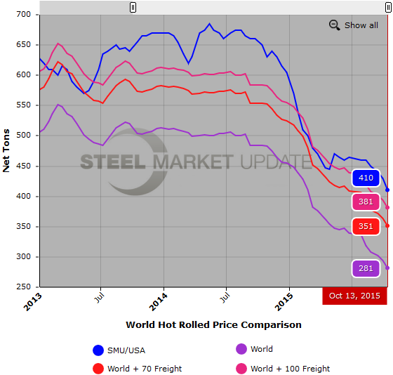 The latest Steel Market Update hot rolled price average is $410 per ton for domestic steel, down $20 per ton compared to the last time we did an update on world prices and down $30 per ton over mid-September. The theoretical spread between the world HR export price and the SMU HR price is $29 to $59 per ton ($129 prior to import costs), down $7 from our previous analysis and down $9 from mid-September.