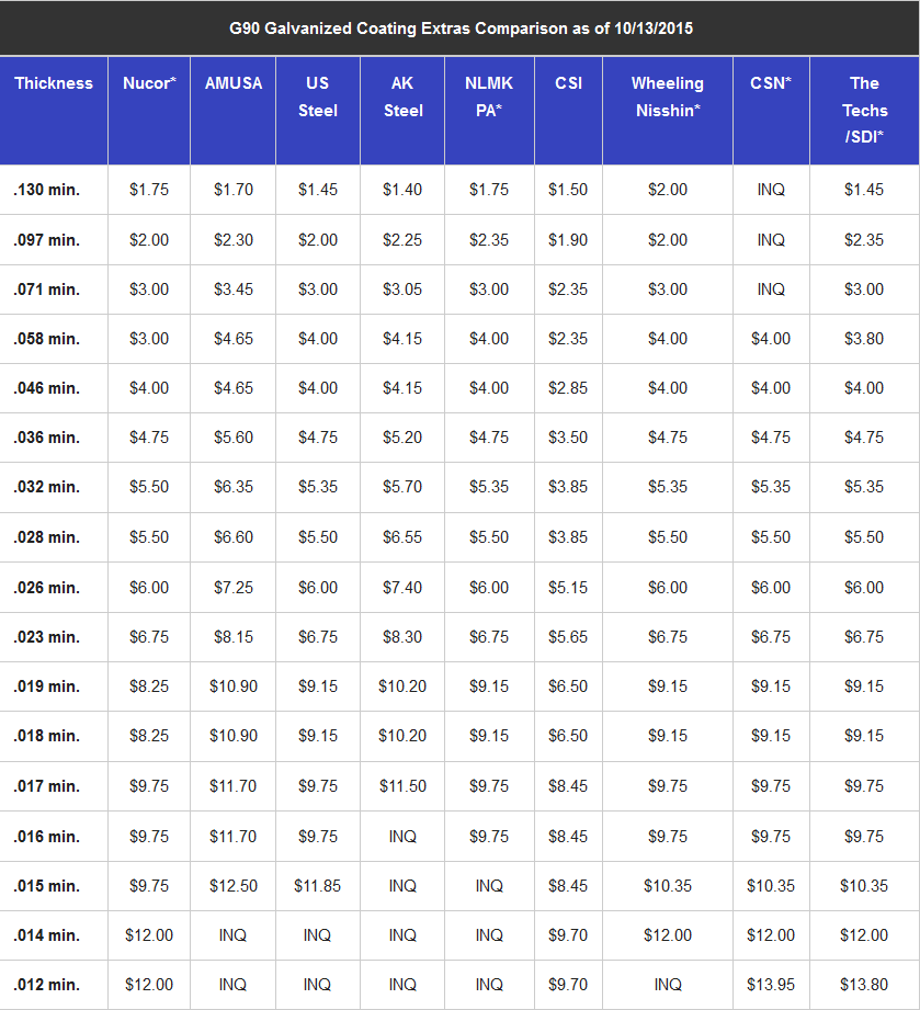 We think we’ve got it right this evening so here is our revised G90 galvanized coating extras table (ArcelorMittal USA website is a bit confusing as they state the extras are as of January 1, 2014 but they were revised December 1, 2014):