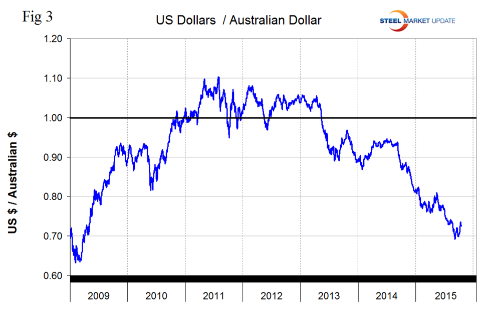 It does not necessarily follow that the steel trading currencies follow the BI but in the last month that has been the case. In one month through August 29th the dollar strengthened against 13 of the 16 currencies examined here. In one month through September 21st it weakened against 8 and in one month through October 15th it weakened against 14. Quite a reversal and as we mentioned above, the main reason was that the market had priced in the anticipation of a US interest rate increase.