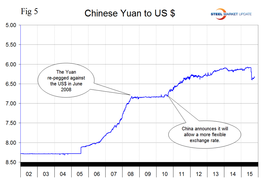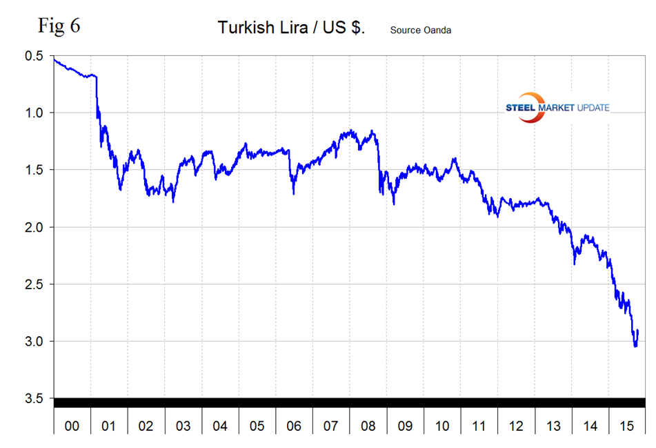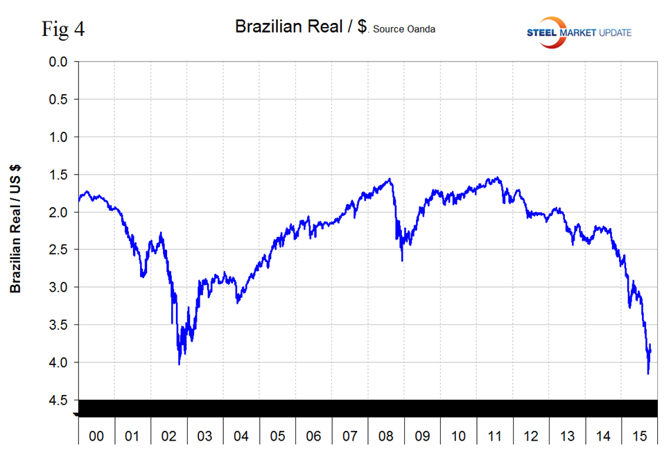 The Brazilian Real is one of only three of the steel trading currencies to have continued to decline in the last month. It has declined by 38.2 percent in 12 months, by 18.9 percent in 3 months, by 0.3 percent in 1 month and by 0.7 percent in the last 7 days (Figure 4).