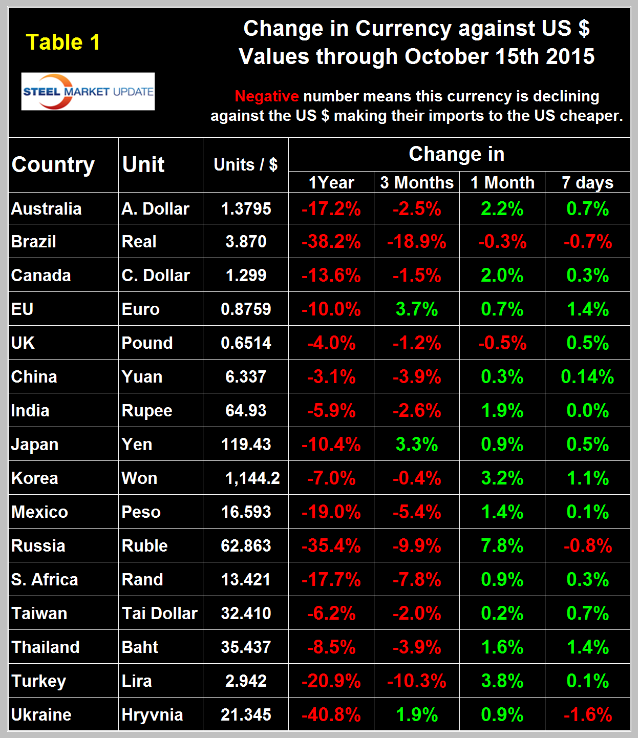 Table 1 shows the number of currency units of steel trading nations that it takes to buy one US dollar and the change in one year, three months, one month and seven days. The table is color coded to indicate strengthening of the dollar in red and weakening in green. We regard strengthening of the US Dollar as negative and weakening as positive because the effect on net imports.