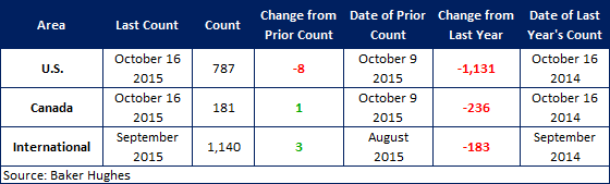 According to Baker Hughes data from October 16, 2015, the U.S rig count for the week was 787 rigs exploring for or developing oil or natural gas. This is a decrease of 8 rigs when compared to last week, with oil rigs down 10 to 595 rigs, gas rigs up 3 to 192 rigs, and miscellaneous rigs down 1 to 0 rigs. Compared to this time last year, the 787 count is down 1,131 rigs, with oil rigs down 995, gas rigs down 136, and miscellaneous rigs unchanged.