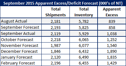 The Metal Service Center Institute (MSCI) released September shipments and inventories for U.S. distributors. We reported in Thursday evening’s issue that flat rolled steel shipments were weaker than expected while receipts were higher than expected. The combination of the two has driven our Apparent Excess to over 1 million net tons.