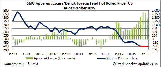 The SMU Flat Rolled Service Center Apparent Excess/Deficit model is based on the number of days supply distributors need to have for their inventories to be in balance. Based on our model service centers are carrying 1,038,000 tons more than what is needed to be in balance.