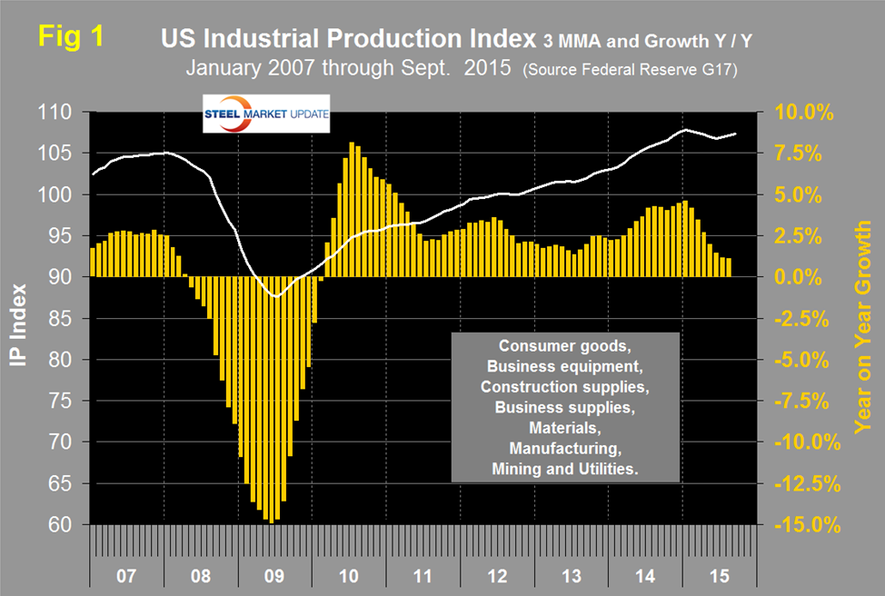 Both these data points are reported in the Federal Reserve G17 data base. The index had an all-time high of 107.9108 in November last year but on a month over month basis has declined for eight of the first nine months of 2015. On a year over year basis using a three month moving average (3MMA) growth is still positive but has declined from 4.5 percent in January to 0.93 percent in September (Figure 1).