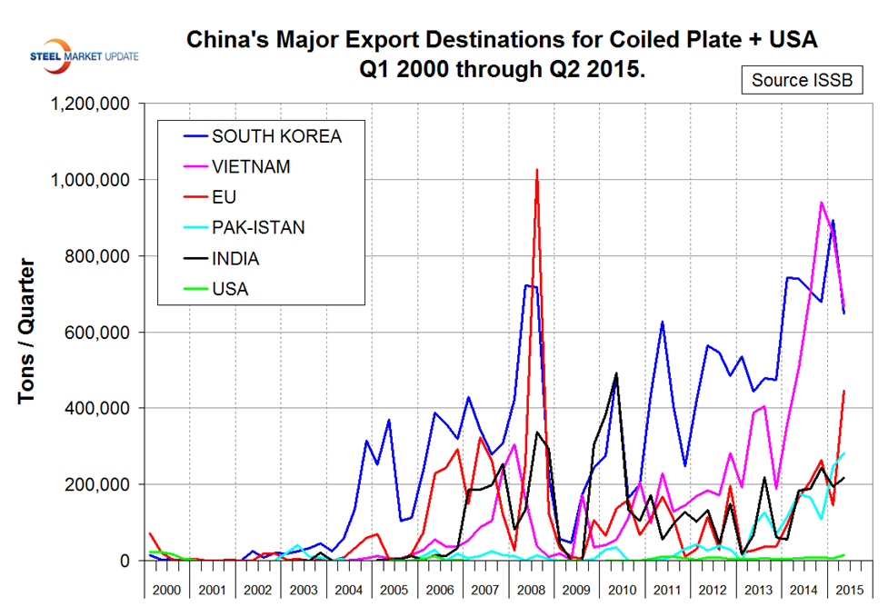 No surprise, China dwarfs the other five. Japan has more than doubled its coil plate exports since Q1 2009. There was a huge increase in China’s export volume in 2014 but in Q2 2015 the tonnage fell. Is that the start of a trend? Is displaced Chinese tonnage looking for a home somewhere else? The majority of the decline in Chinese tons was to South Korea and Vietnam as shown in Figure 2.