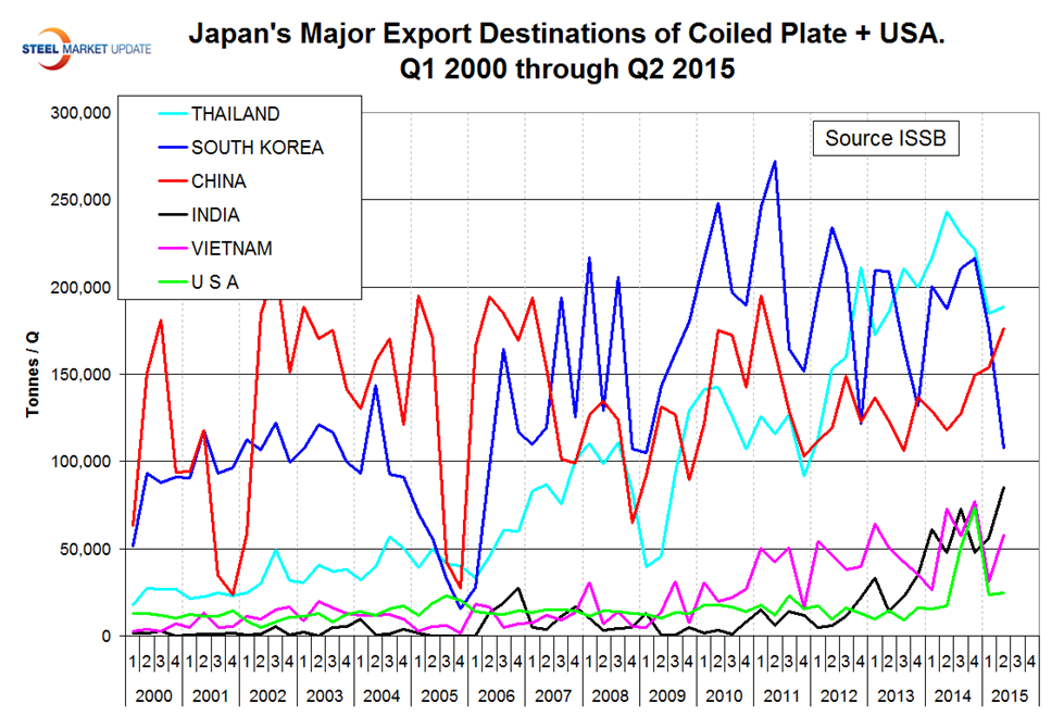 In this case the US was the 8th in terms of tons shipped from Japan. There was a spike in tonnage to the US in Q4 2014 and a recent surge to Thailand and India.