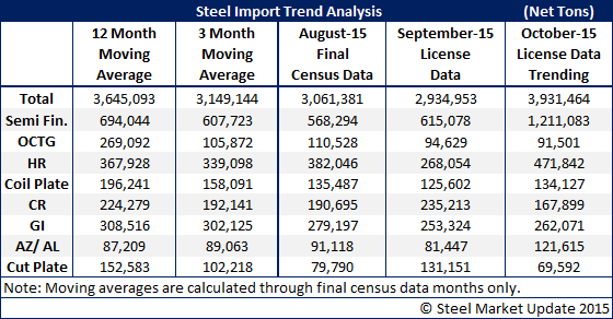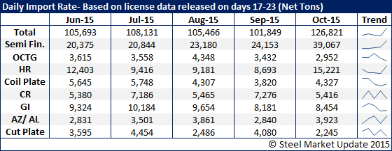 The U.S. Department of Commerce (US DOC) released the latest import license data for the month of October. Based on the 2.5 million net tons of license requests through the 20th of the month we are on pace to exceed 3.5 million tons for the month of October.