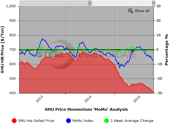 The graph below demonstrates the relationship between the SMU hot rolled coil price, the SMU Price MoMo Index, and the three week moving average change in the MoMo Index. Initially published in our Tuesday evening issue, the SMU HRC price range for this week is $380-$430 per ton with an average price of $405, down $5 per ton from last week.