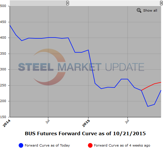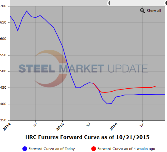 Below is a graphic of the HRC Futures Forward Curve. The interactive capabilities of the graph can only be used in Steel Market Update website here. If you have any issues logging in or navigating the website please contact us at info@steelmarketupdate.com or (800) 432 3475.