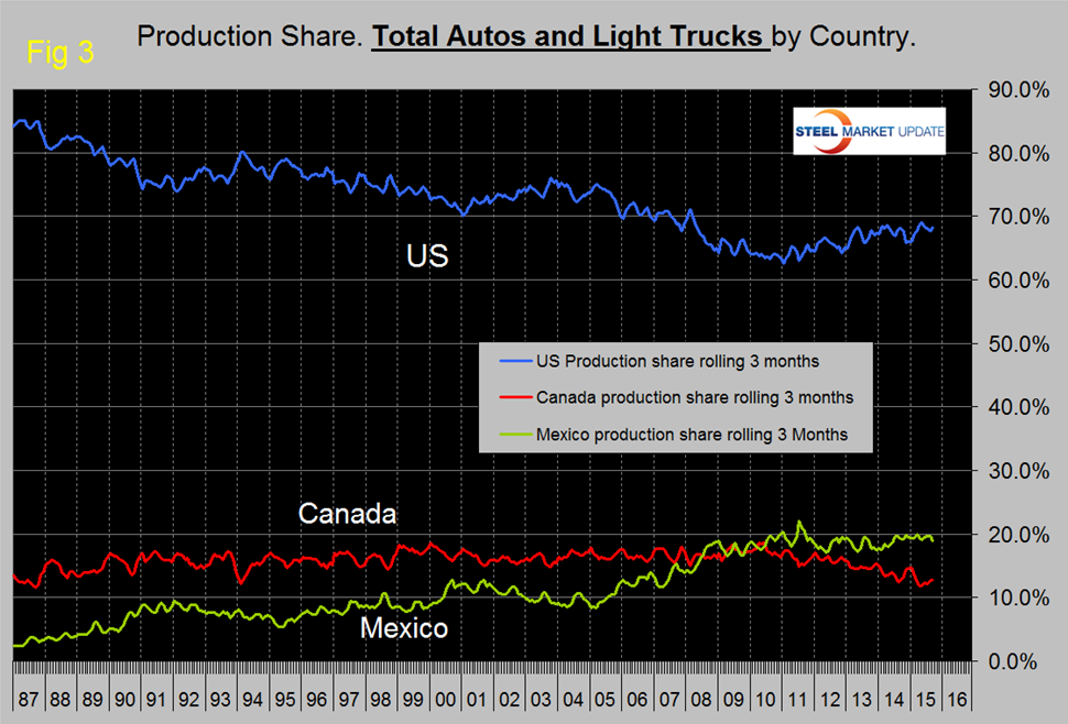 Growth rates in 3 months through September y/y indicate that the US and Canada have positive momentum but that of Mexico is negative. Mexico has had negative momentum for five straight months and in six of the last seven months. The US has gained production share in the most recent 3.5 years (Figure 3) and so far in 2015 that gain has accelerated at the expense of Canada. Mexico’s share has been fairly flat.