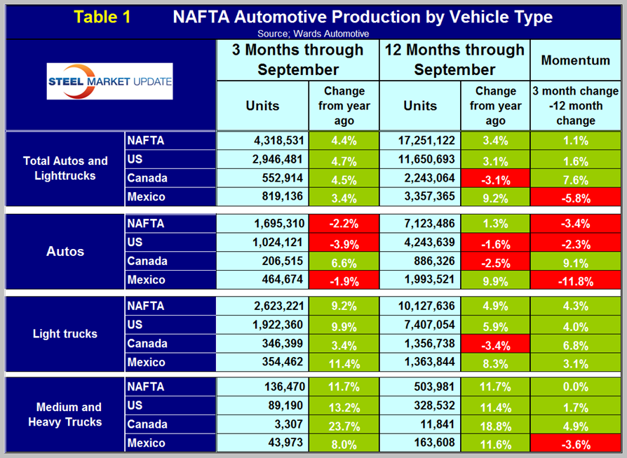In the 12 months through October 15th, compared to the US $ the Canadian $ has depreciated by 13.6 percent and the Mexican Peso by 19.0 percent. These decline must be causing auto assemblers to look at moving production to Mexico in particular. We believe there is spare capacity both sides of both borders for the automotive manufacturers to play this game. This isn’t happening so much in Canada in spite of the depreciation of the Loonie because (in our opinion) the labor relations situation in Canada is causing manufacturers in general to reduce their exposure. US steel is a case in point.