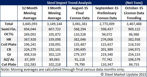 The bad news (if you are a steel mill) is October license data continues to point to a 3.0 million plus tonnage month and, at this moment, is trending toward 3.47 million tons. The biggest increase in tonnage, however, is due to the steel mills themselves as license data is trending just shy 1.0 million net tons of slabs and there is also an increase of hot rolled coil (a portion of which is also going to domestic steel mills).