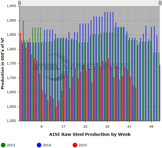 For the week ending October 24, 2015, the American Iron & Steel Institute (AISI) estimated the U.S. steel industry produced 1,667,000 net tons of raw steel, a 0.5 percent decrease over the previous week and a 9.4 percent decrease over the same week one year ago. The estimated capacity utilization rate is 69.7 percent, down from 70.1 percent last week and down from 76.5 percent this time last year.
